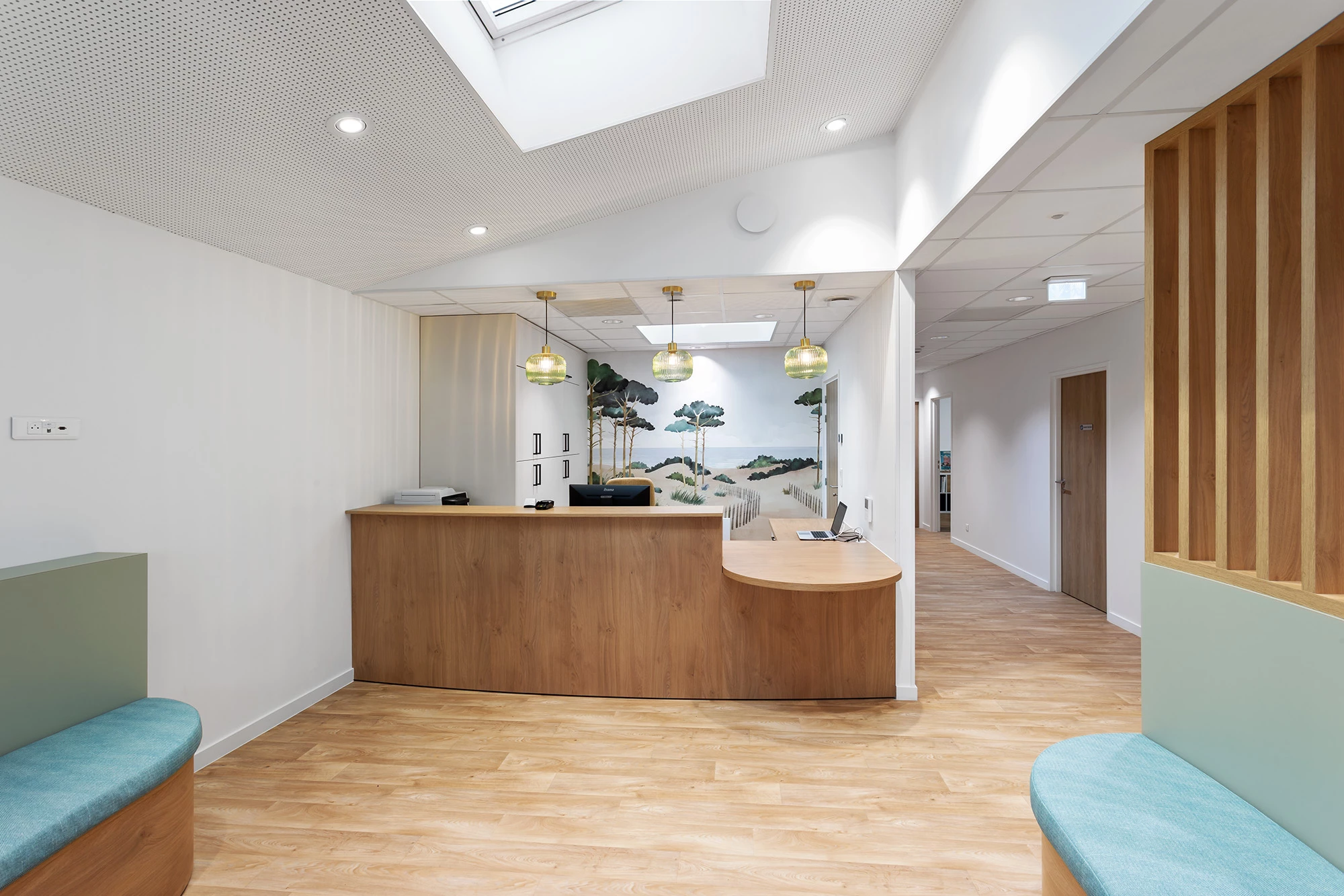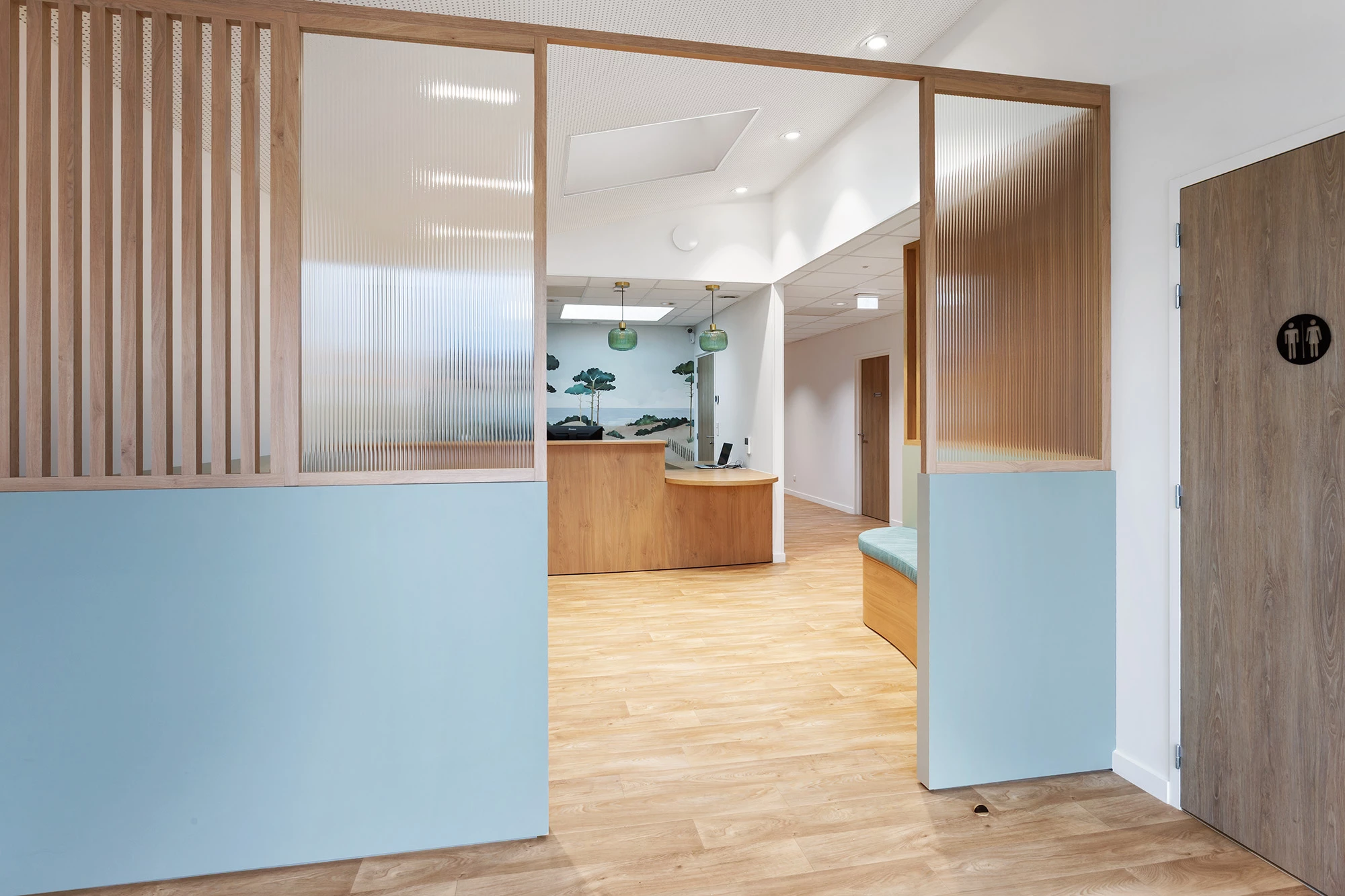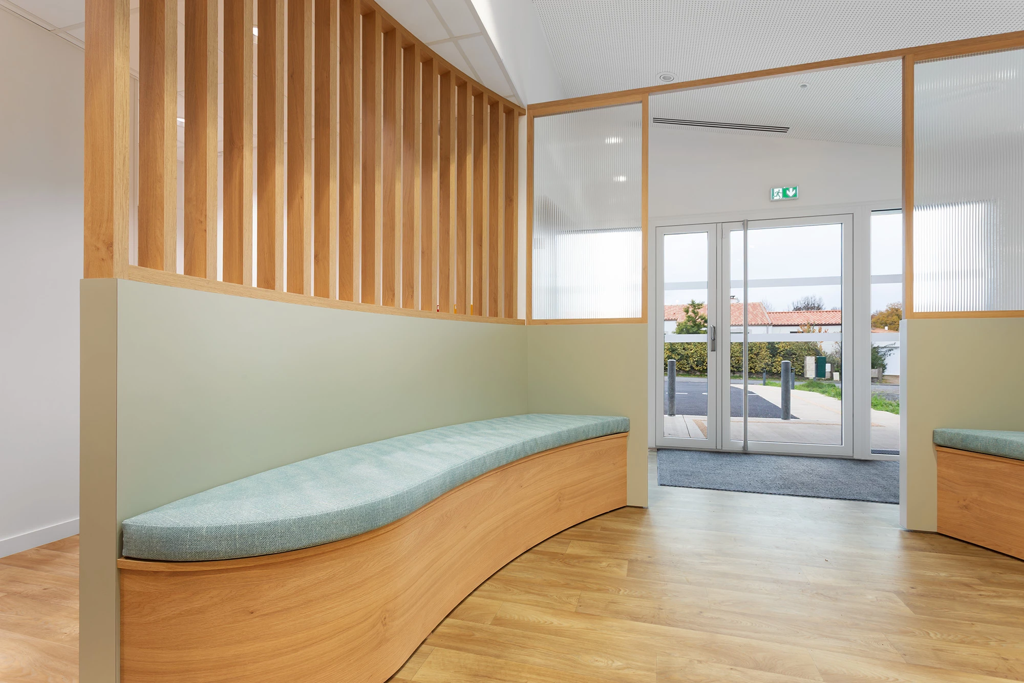 Une attention particulière a été portée à la qualité de l’accueil, pensé comme une séquence de strates spatiales progressives comprenant : un sas d’entrée protecteur semi-fermé, un hall d’accueil généreux intégrant un espace d’attente, baigné de lumière naturelle grâce à un puits de lumière. La banque d’accueil vient conclure ce parcours en offrant un repère clair et rassurant dès l’arrivée. Cette mise en scène de l’entrée contribue au confort des patients et à la lisibilité des parcours.